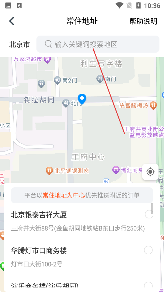 4、進入常住地址頁面,通過搜索或地圖選地址,平臺依據此優先推附近訂單,選好地址完善入駐最后一步,讓平臺知曉服務覆蓋區域,后續就能接收適配的家裝服務訂單。
