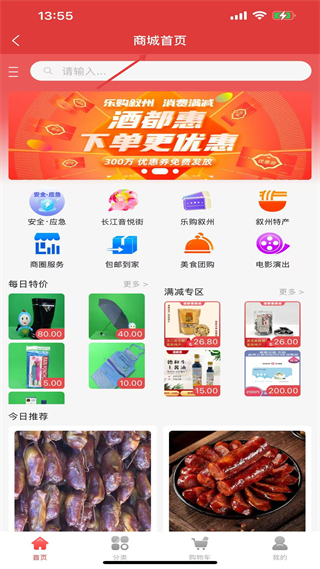 3、商城板塊,有安全應急、敘州特產等服務入口,還有每日特價、滿減專區及特產推薦,滿足消費需求。