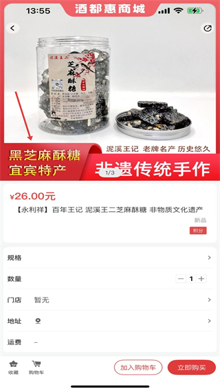 4、商品板塊,展示宜賓特產黑芝麻酥糖,為非物質文化遺產,可查看商品價格、規格等信息,支持加入購物車和立即購買。