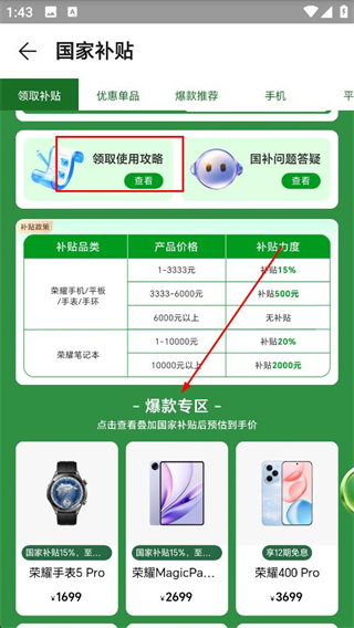 3、登錄后進入國家補貼頁面可查看領取使用攻略和補貼品類、力度,還能查看爆款專區的商品。