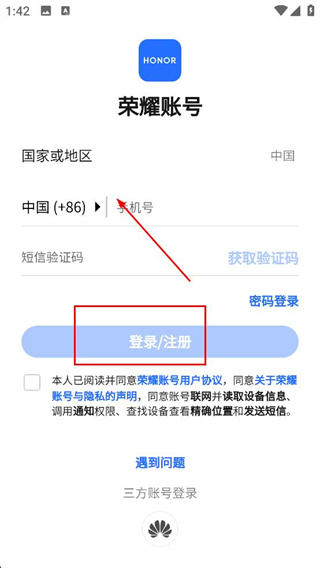 2、在榮耀賬號登錄頁面輸入手機號,獲取并輸入驗證碼,閱讀并同意相關協議后點擊登錄注冊。