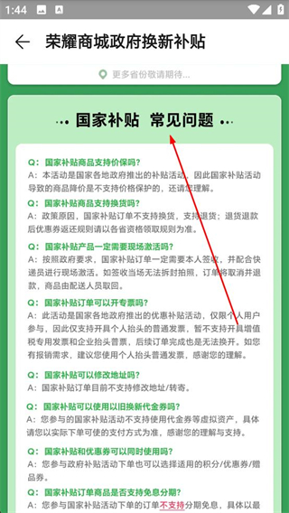 4、在國家補貼常見問題頁面可了解國家補貼是否支持換購、是否需要現場激活等問題,解答補貼相關疑惑。
