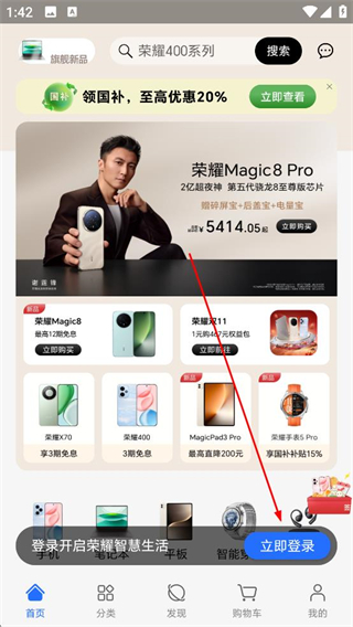 1、進入榮耀APP首頁,可查看榮耀Magic8Pro手機等商品,點擊立即登錄可進入榮耀賬號登錄頁面。