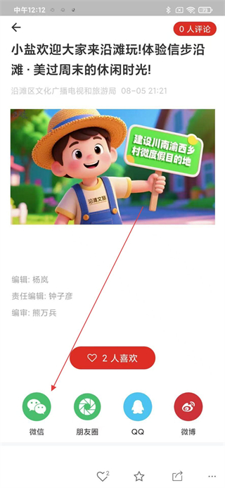 4、在詳情頁底部找到分享按鈕,點擊彈出分享選項,選擇微信等渠道,完成該資訊內容的分享。