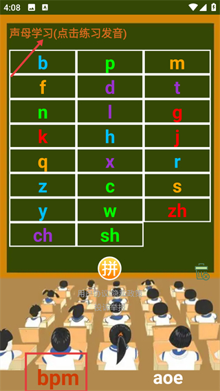 1、拼音學習工具的聲母學習界面,展示全部聲母,支持點擊練習發音,幫助學習者掌握聲母讀音,是拼音入門基礎環節。