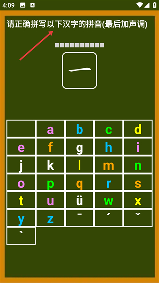 2、此為漢字拼音拼寫練習界面,需按顯示漢字從字母鍵盤選對應拼音加聲調,通過實操鞏固拼讀與拼寫能力。