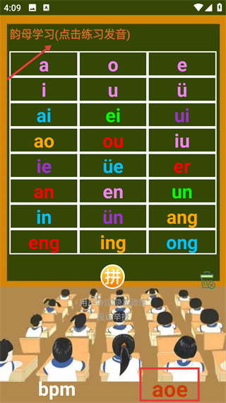 3、韻母學習界面,涵蓋單韻母、復韻母等全部類型,支持點擊練習發音,與聲母學習配合助力掌握完整拼音基礎。