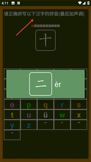 4、該界面是二字拼音拼寫練習,正確拼音為èr,借具體漢字練習強化拼音規則的實際應用能力。