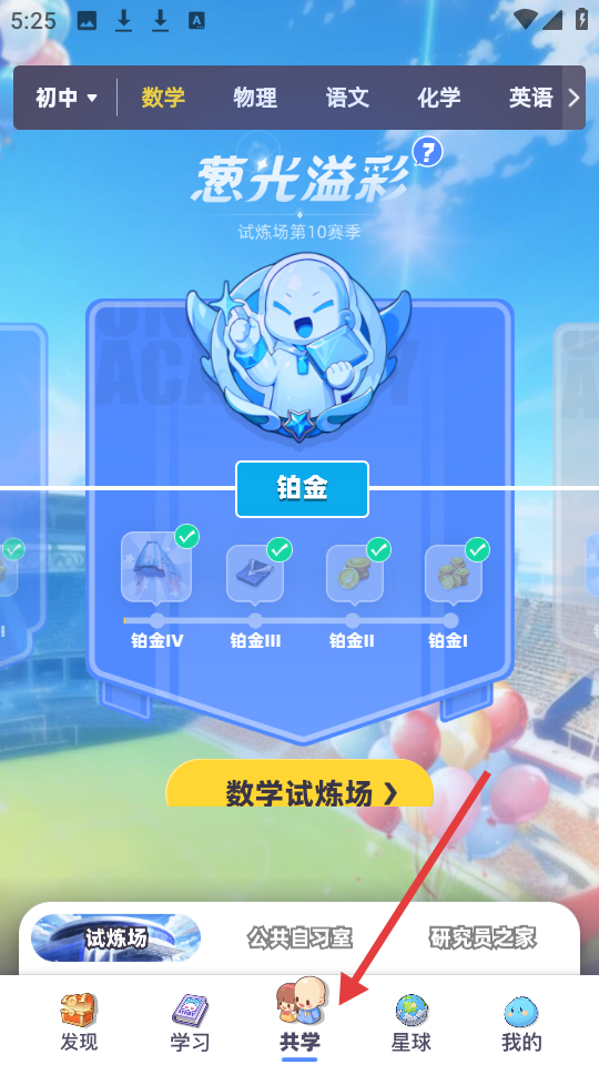 1、點共學頁面試煉場第10賽季蔥光溢彩開啟,顯示鉑金段位,含數學試煉場等板塊增添學習趣味性。