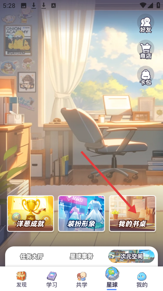 3、星球內的次元空間場景,可進行好友互動商店購物等,還能查看洋蔥成就、裝扮形象定制個性化我的書桌。