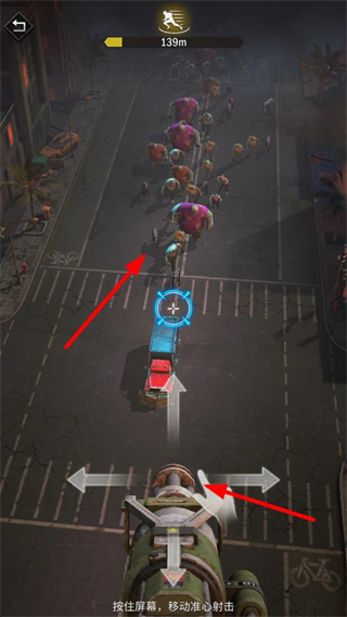1、按住屏幕移動準心,瞄準追擊的僵尸群射擊,阻止僵尸靠近車輛,開啟末日射擊防御之旅。