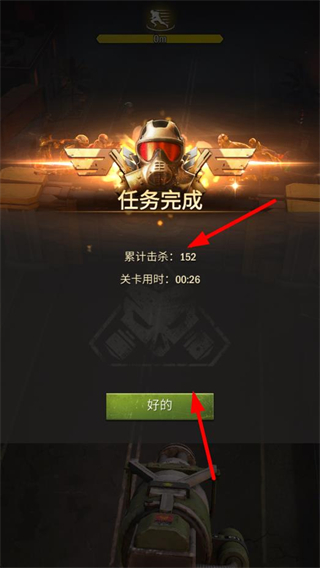 3、完成任務后查看累計擊殺數和關卡用時,點擊好的按鈕,領取獎勵,解鎖新的武器和關卡。