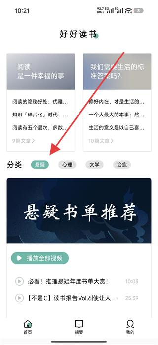 1、進入軟件首頁瀏覽閱讀是一件幸福的事等文章分類,點擊懸疑分類,查看懸疑書單推薦的視頻內容,了解閱讀分類與推薦資源,確定閱讀方向。
