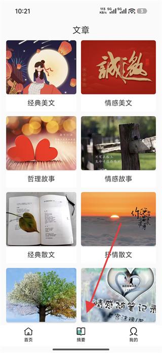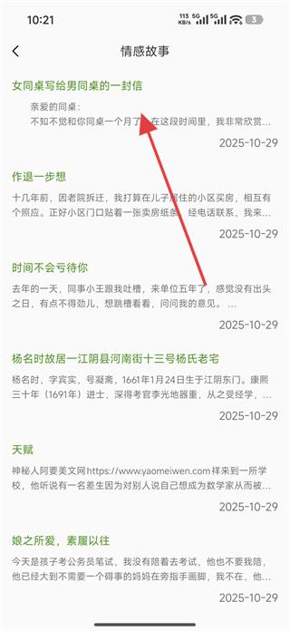 2、點擊摘要進入文章頁面,查看經典美文、情感美文等文章分類,挑選情感故事分類,準備閱讀相關文章,豐富閱讀體驗。