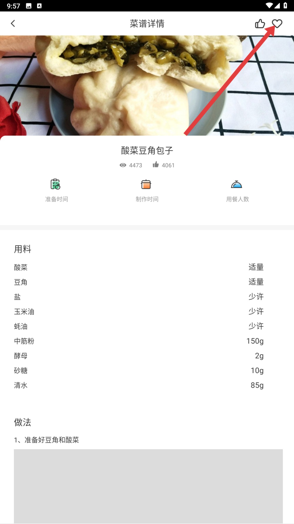 2、進入菜譜詳情界面,我們要點擊右上角的心形收藏按鈕,將該菜譜收藏。