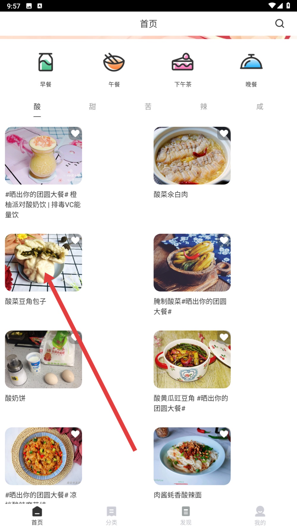 1、美食APP首頁,點擊感興趣的菜譜,如酸菜豆角包子,進入菜譜詳情界面。