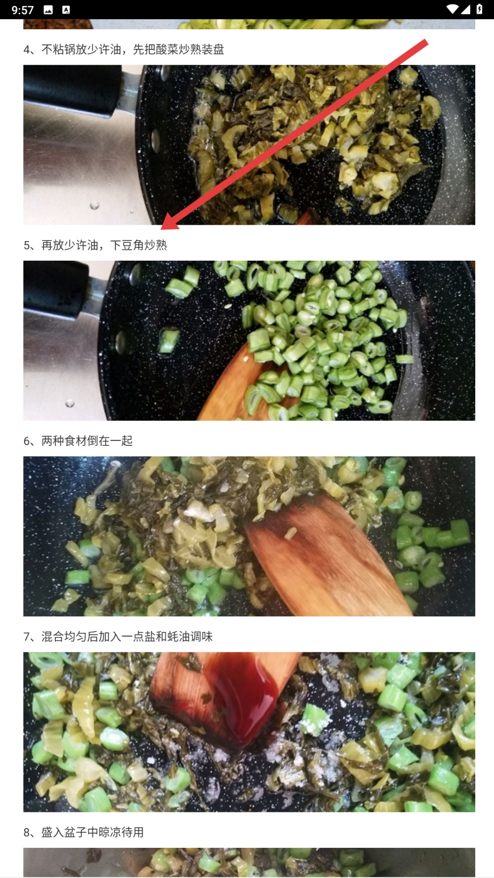 3、菜譜做法界面,可查看詳細的烹飪步驟,如酸菜和豆角的炒制過程等。