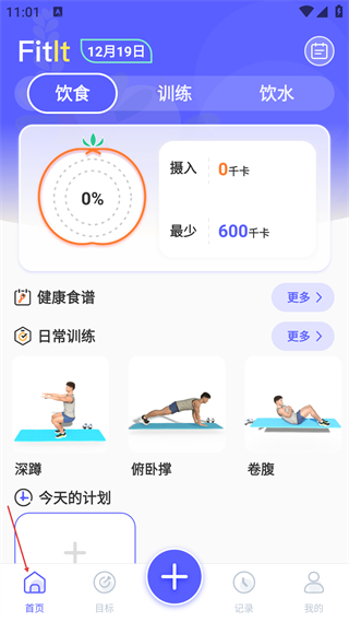 1、進入首頁可查看飲食攝入進度,同時能找到健康食譜日常訓練板塊,選擇深蹲俯臥撐等訓練動作,助力開展日常健身活動。