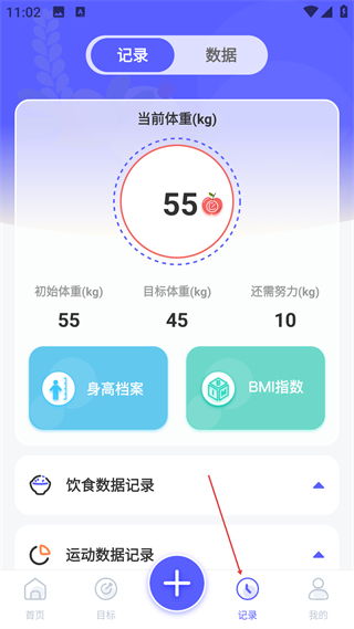 3、進入記錄頁面可查看當前體重等信息,還能使用身高檔案BMI指數功能,同時可記錄飲食和運動相關的數據內容。