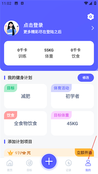 4、進入我的頁面可進行登錄操作,查看健身計劃相關內容,包括目標體育活動等信息,還能對健身計劃進行修改調整。
