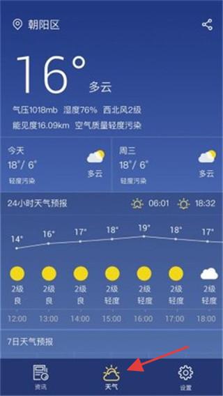 2、點擊天氣頁面,定位朝陽區,清晰呈現實時天氣、氣壓濕度等,還有24小時及7日天氣預報。