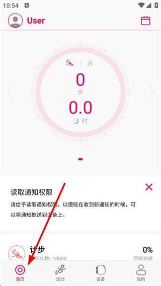 1、進入首頁可查看步數、運動時長等數據,還有計步目標完成情況,底部有首頁、運動、設備、我的導航選項。