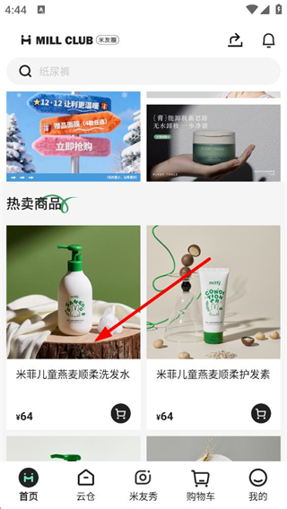 1、進入米友圈首頁,可看到熱賣商品板塊,選擇其中的米菲兒童燕麥順柔洗發水,點擊該商品即可進入對應的詳情頁面。