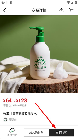 2、進入商品詳情頁,查看米菲兒童燕麥順柔洗發水的價格區間,點擊頁面底部的立即購買按鈕,進入規格選擇環節。