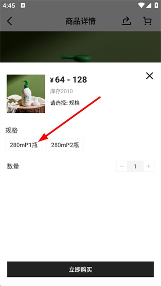 3、點擊立即購買后彈出規格選擇窗口,可選擇280ml1瓶等規格選項,選定對應的規格后即可繼續后續購買操作。