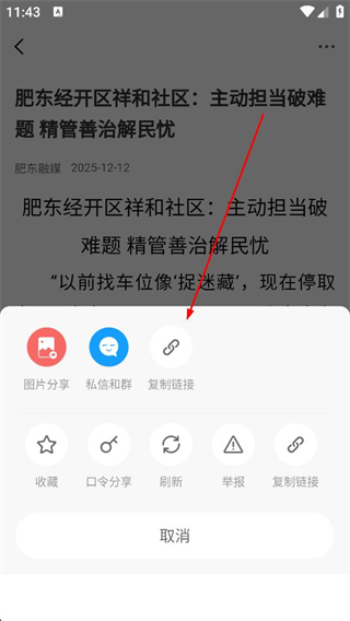 3、在資訊詳情頁面點擊分享按鈕,選擇圖片分享私信好友等方式,也可復制鏈接。