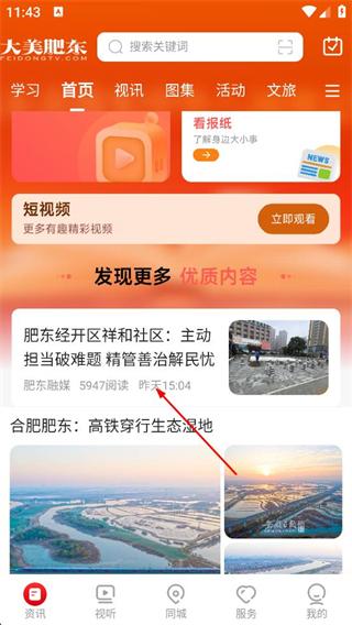 1、打開大美肥東app,進入首頁后瀏覽推薦的資訊內容,選擇感興趣的咨詢,點擊即可進入該資訊的詳情頁面,查看具體的文字和配圖信息。