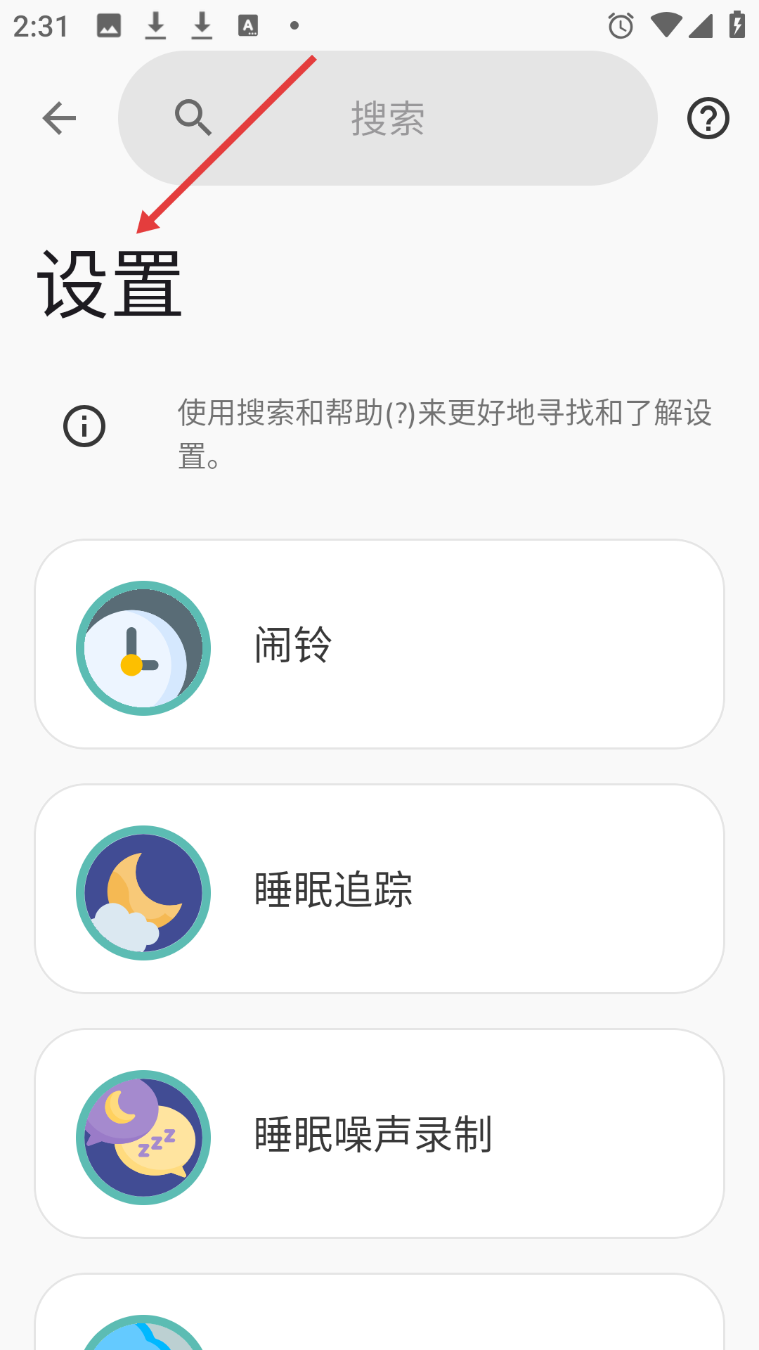 1、設置頁面有搜索欄和幫助標識,提供鬧鈴、睡眠追蹤、睡眠噪聲錄制等功能選項,方便用戶查找和了解設置內容。