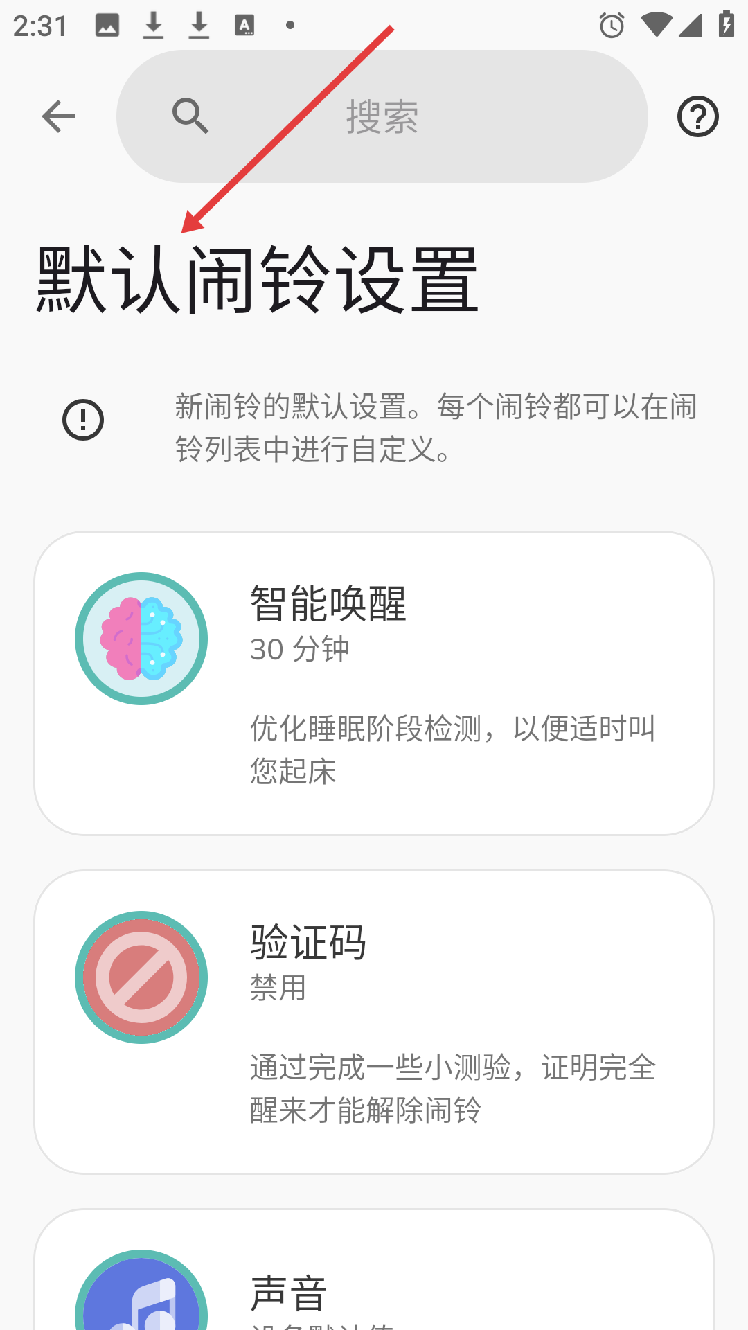 2、默認鬧鈴設置頁面,可對新鬧鈴進行默認設置,有智能喚醒、驗證碼等功能,且每個鬧鈴都能在鬧鈴列表自定義。