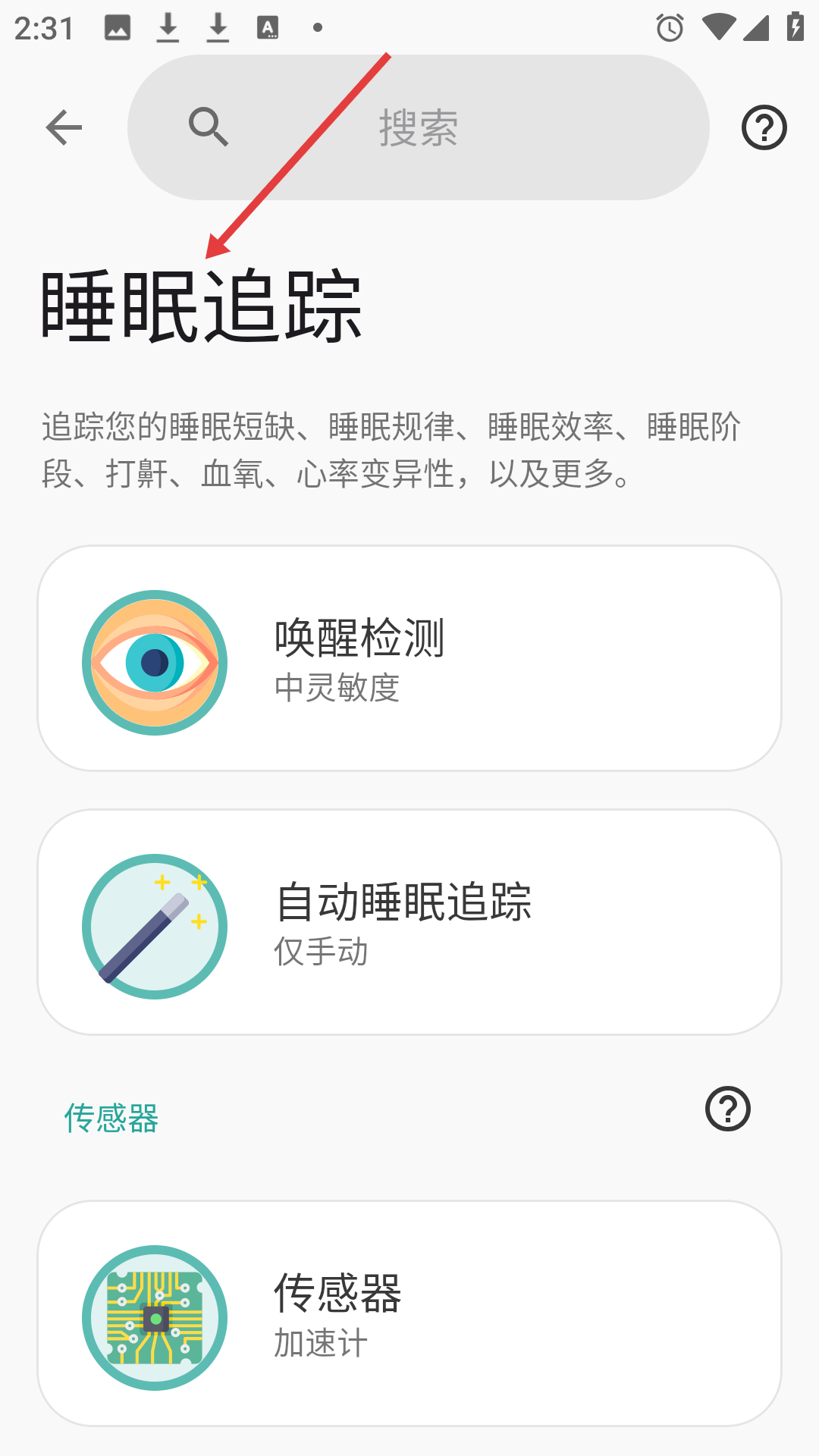 3、睡眠追蹤頁面,能追蹤睡眠短缺、規律等多方面情況,有喚醒檢測、自動睡眠追蹤等功能,還涉及傳感器相關設置。
