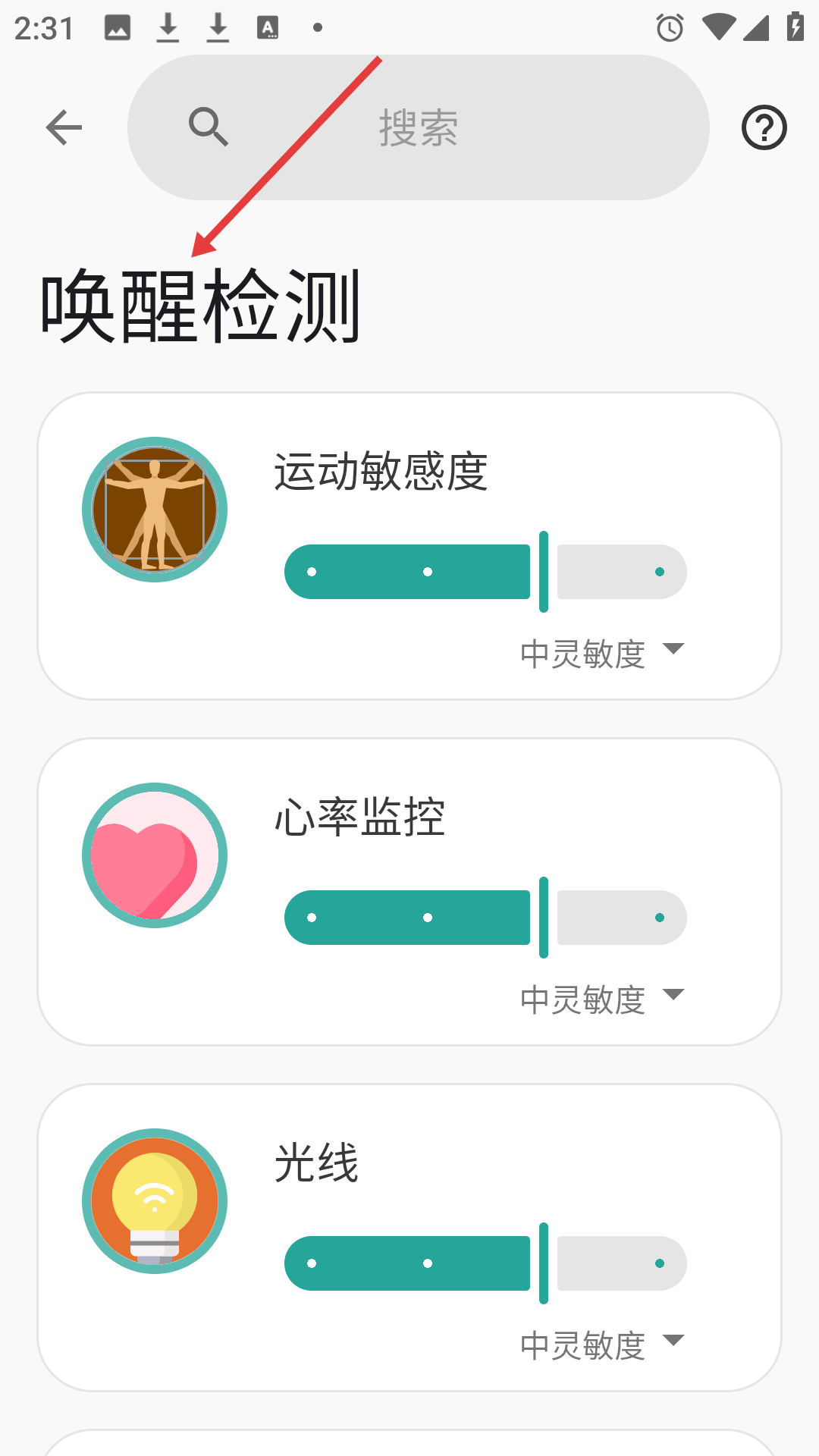 4、喚醒檢測頁面,可調節運動、心率、光線的敏感度,均設為中靈敏度,幫助更精準地檢測睡眠中的喚醒情況。