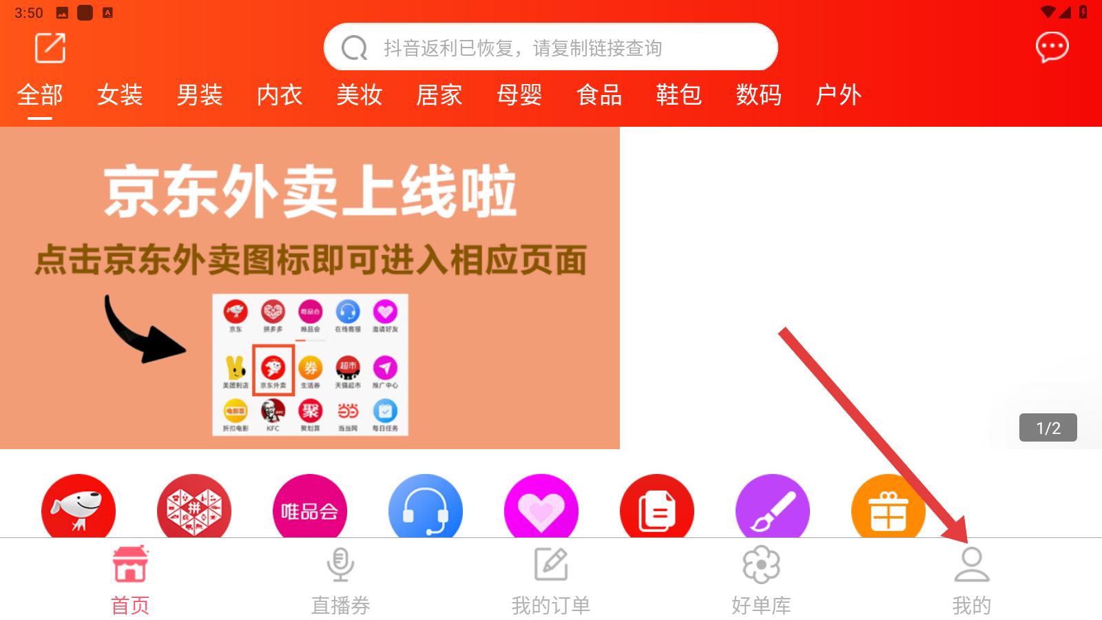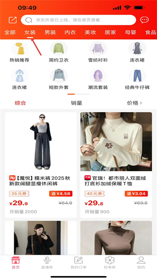 1、首頁有京東外賣等功能圖標,頂部分類欄包含女裝男裝等多個選項,先停留在首頁,找到頂部分類欄里的女裝分類準備點擊操作。