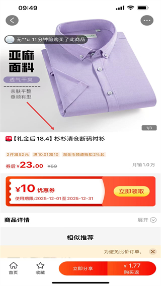 4、進入商品詳情頁,看到亞麻面料等商品特點還有優惠券可領取,了解價格和優惠活動后,可準備進行購買相關的操作步驟。