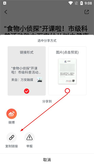 4、在分享方式界面選擇鏈接形式,再選定想要分享的平臺,點擊對應選項,完成該資訊內容的分享。