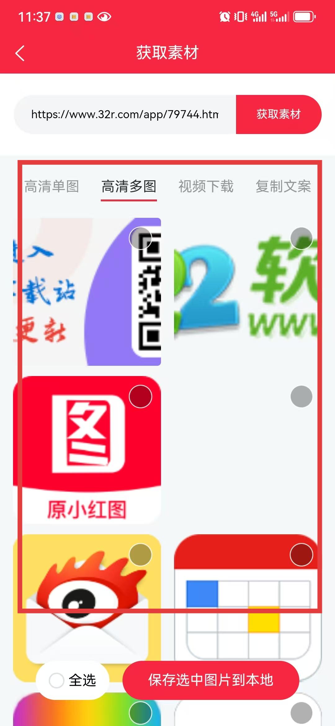2、搜索后進入獲取素材頁,若想批量獲取照片,切換到高清多圖標簽,這里會展示相關圖片集合,勾選需要的照片選好后點保存選中圖片到本地,即可批量存到手機。