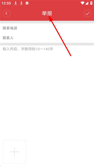 3、舉報界面,需填寫聯系電話、聯系人、舉報內容,還可添加圖片,填寫完成后點擊確認按鈕提交舉報信息。