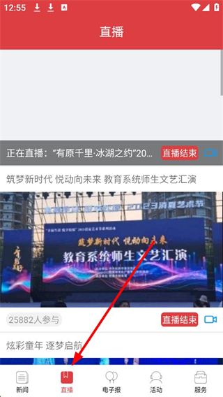 4、返回首頁,點擊底部直播按鈕進入直播界面,可查看正在直播和已結束的直播內容,了解本地各類活動直播動態。
