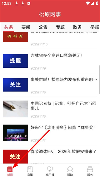 1、打開松原網事APP,進入新聞界面,可看到頭條、要聞等欄目,展示多條本地新聞資訊,點擊底部服務按鈕進入本地服務界面。