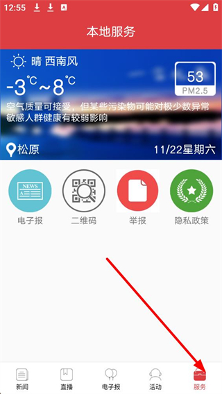 2、本地服務界面,可查看松原的天氣、空氣質量等信息,還有電子報、二維碼等功能入口,點擊舉報按鈕進入舉報界面。