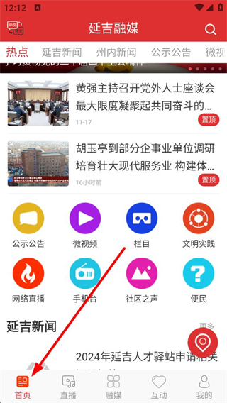 1、進入延吉融媒APP首頁,可看到熱點、延吉新聞等多個欄目,還有公示公告、微視頻等服務入口,能瀏覽本地新聞和參與文明實踐等活動。