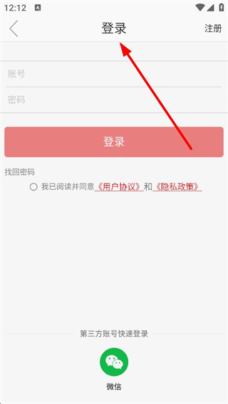 3、登錄頁面,可輸入賬號和密碼登錄,也可選擇微信快速登錄,登錄前需閱讀并同意相關協議,忘記密碼可找回。