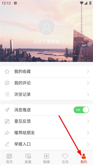 2、點擊底部我的按鈕,進入個人頁面,可進行登錄,使用我的收藏、我的評論等功能,還能設置消息推送、參與意見反饋。