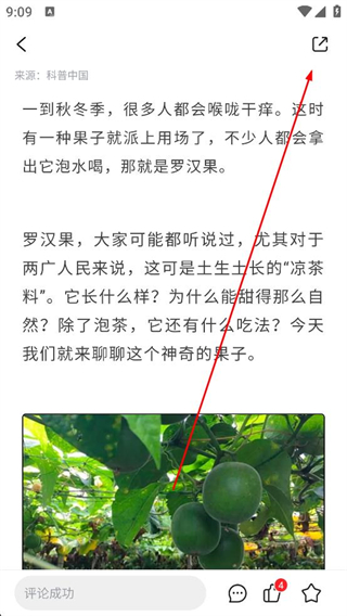 3、在資訊詳情頁閱讀內容了解羅漢果的相關知識,找到頁面右上角的分享按鈕,點擊該按鈕彈出分享方式選擇界面。