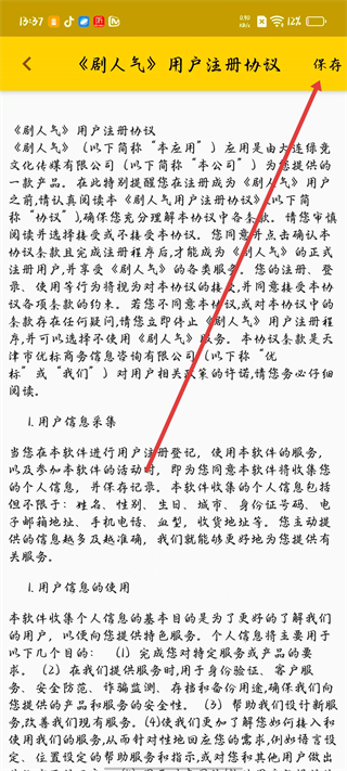 3、進入用戶注冊協議頁面,仔細閱讀劇人氣用戶注冊協議,了解用戶信息采集、使用等條款后點擊保存。