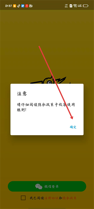 2、在登錄流程頁面會彈出注意提示框,提醒仔細閱讀隱私政策中的使用規則,點擊確定可進入下一步。