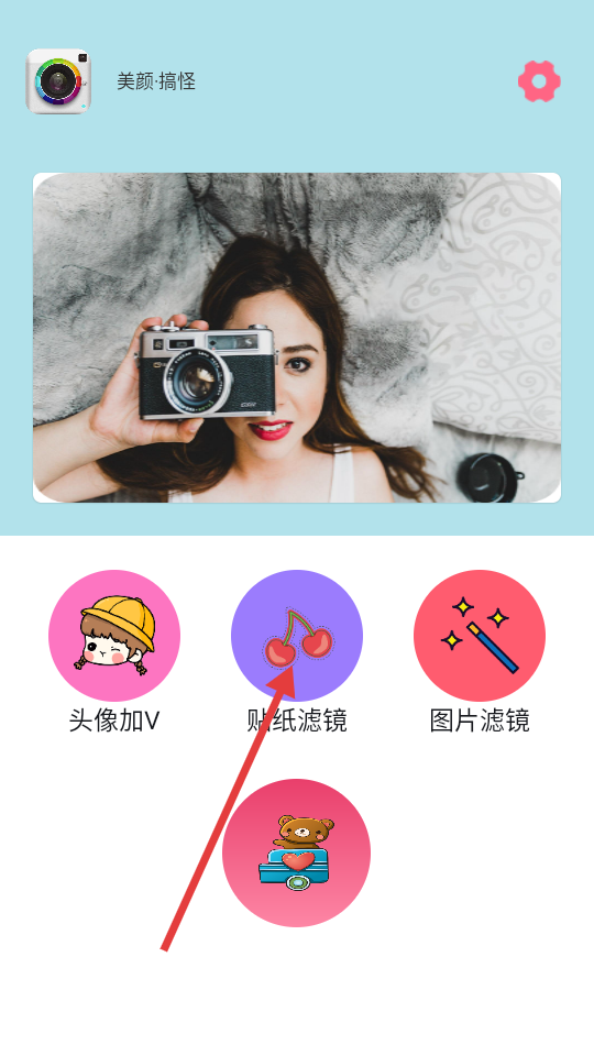 1、打開APP進入美顏搞怪界面,選擇要編輯的照片,點擊貼紙濾鏡功能進入貼紙添加環節,可從下方素材欄挑選喜歡的貼紙,進行拖動、縮放調整位置與大小。